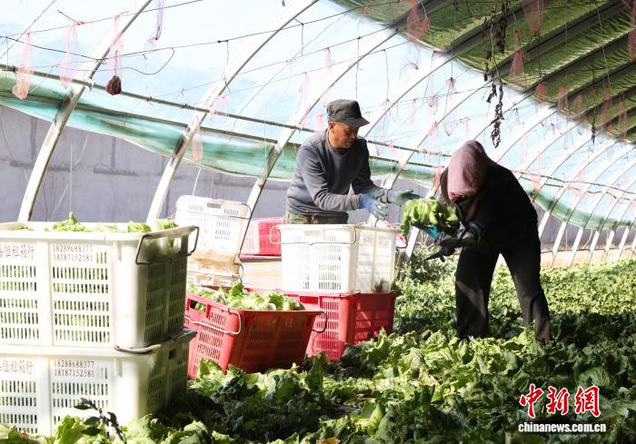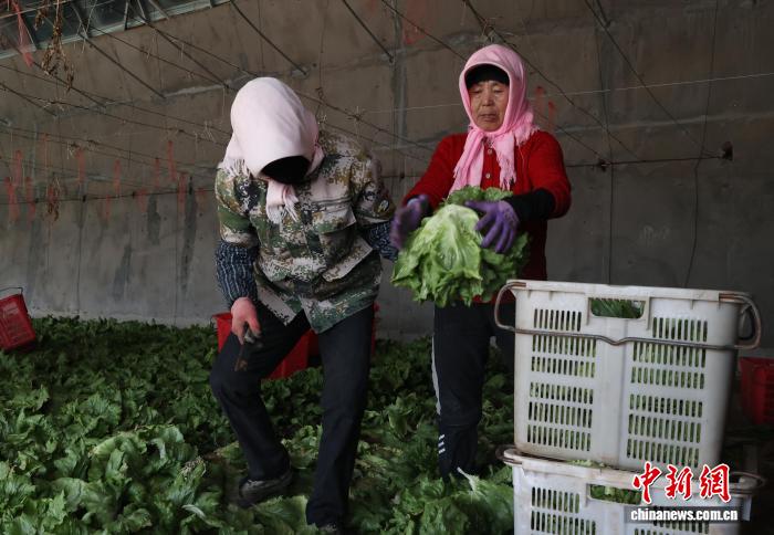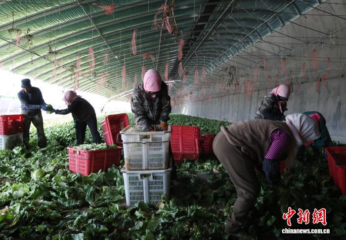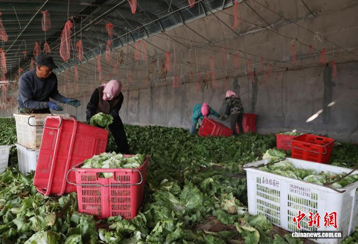 3月17日,正在宁夏银川市金凤区肥土镇的蔬菜年夜棚内乱,任务职员正闲着采支圆死菜。中新社记者 于晶 摄