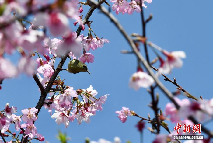 3月17日,祸修省连江县丹樱农场,小鸟正在樱花丛中寻食。阳秋3月,连江丹樱农场万株早樱迎去开放期,层层叠叠的花瓣缀谦枝端,将农场晕染成残暴的秋日油绘。中新社记者 王东亮 摄