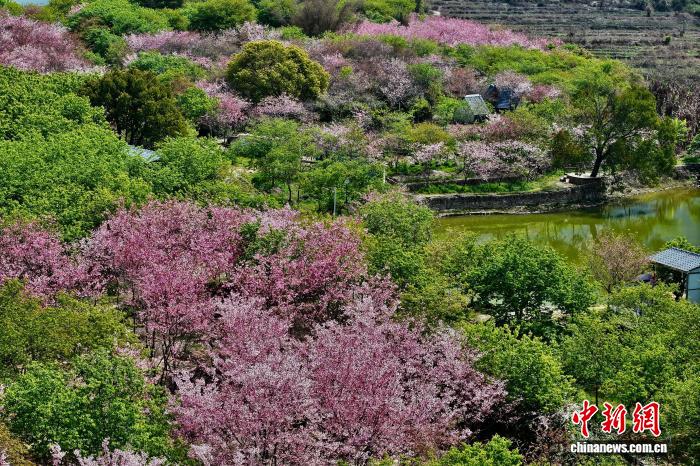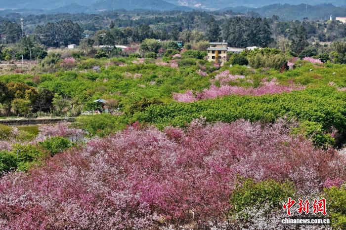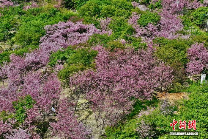 3月17日,祸修连江早樱开放秋意浓。阳秋3月,连江丹樱农场万株早樱迎去怒放期,层层叠叠的花瓣缀谦枝端,将农场晕染成残暴的秋日油绘。(无人机像片)中新社记者 王东亮 摄