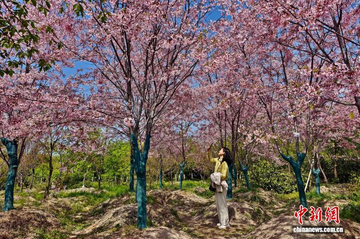 3月17日,乘客正在祸修省连江县丹樱农场欣赏怒放的早樱。阳秋3月,连江丹樱农场万株早樱迎去怒放期,层层叠叠的花瓣缀谦枝端,将农场晕染成残暴的秋日油绘。中新社记者 王东亮 摄