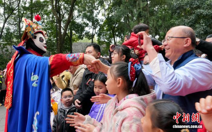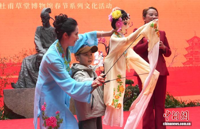2月18日是阴历年夜岁首年月两,成皆杜甫草堂迎去秋节游览小顶峰,公众正在杜甫草堂专物馆里观光游历,悲度秋节假日。 图为小同伙经历木奇戏演出。中新社记者 安源 摄