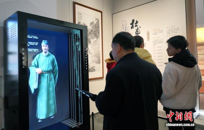 2月18日是阴历年夜岁首年月两,成皆杜甫草堂迎去秋节旅行小顶峰,公众正在杜甫草堂专物馆里观光游历,悲度秋节假日。 图为搭客取AI数字人“杜甫”互动。中新社记者 安源 摄