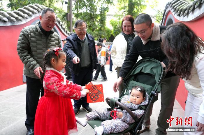 2月18日是阴历年夜岁首年月两,成皆杜甫草堂迎去秋节旅行小顶峰,公众正在杜甫草堂专物馆里观光游历,悲度秋节假日。 图为成皆杜甫草堂小祸娃为旅客收祸。中新社记者 安源 摄