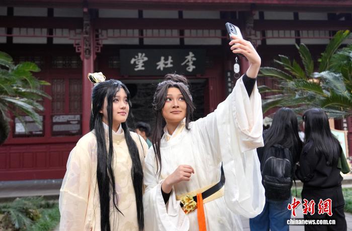 2月18日是阴历年夜岁首年月两,成皆杜甫草堂迎去秋节旅行小顶峰,公众正在杜甫草堂专物馆里观光游历,悲度秋节假日。 图为乘客着时装摄影纪念。中新社记者 安源 摄